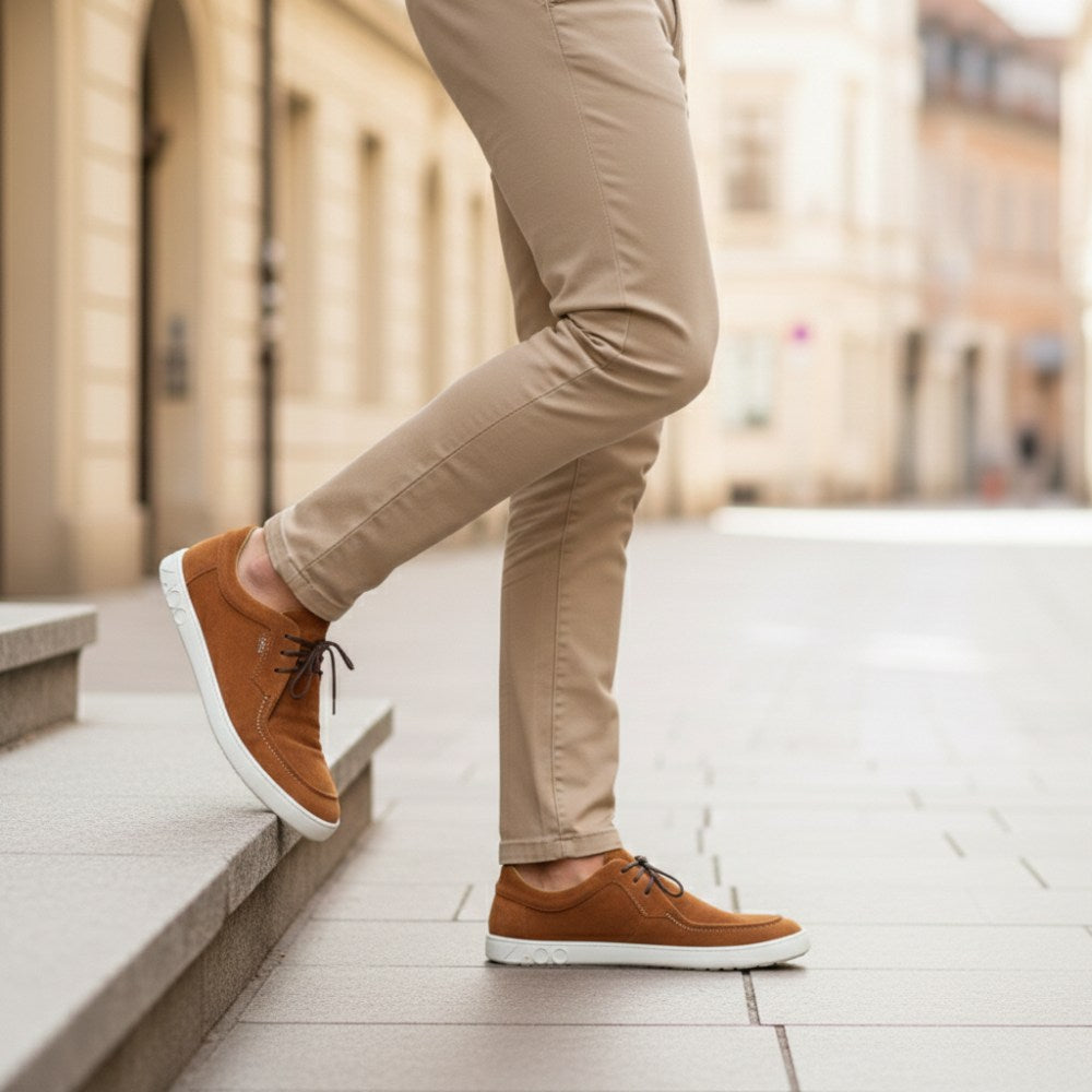 Mit dem Premium Veloursleder in einem warmen Braunton bieten diese Barfußschuhe nicht nur ein ansprechendes Äußeres, sondern auch hohen Tragekomfort. Die elegante 3 Loch Schnürung sorgt für eine klassische Note, während die weiße Sohle als optischer Kontrast einen modernen Twist hinzufügt.