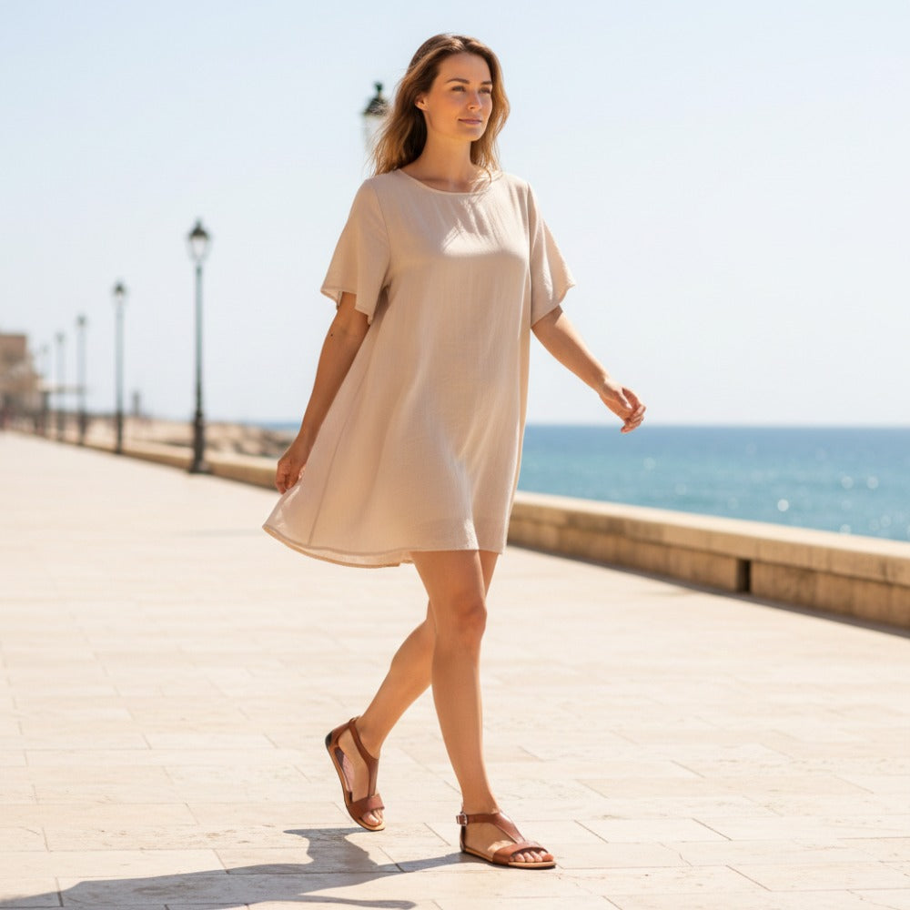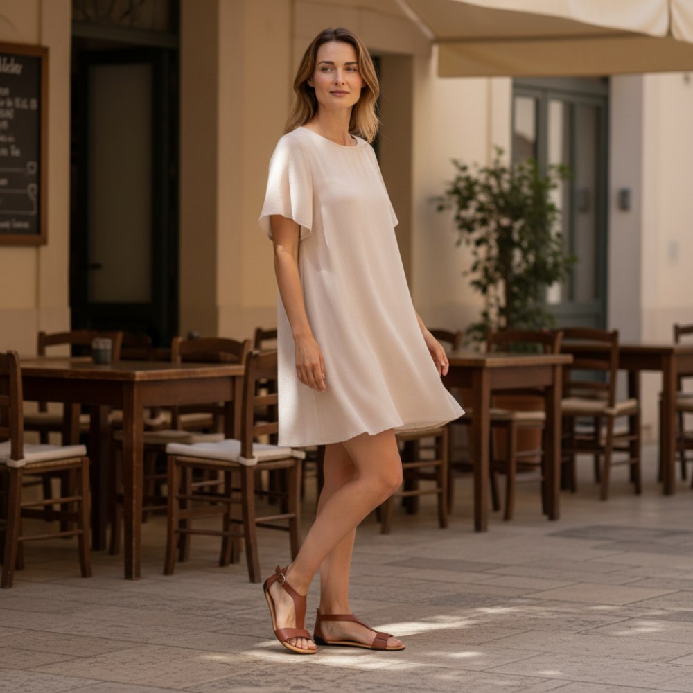 We hebben de voorriem voorzien van een smalle elastische band. Het is nauwelijks zichtbaar, maar geeft je onmiskenbaar comfort. De riem past zich perfect aan je voet aan. In het enkelgebied sluit je de sandalen met een delicate gesp.