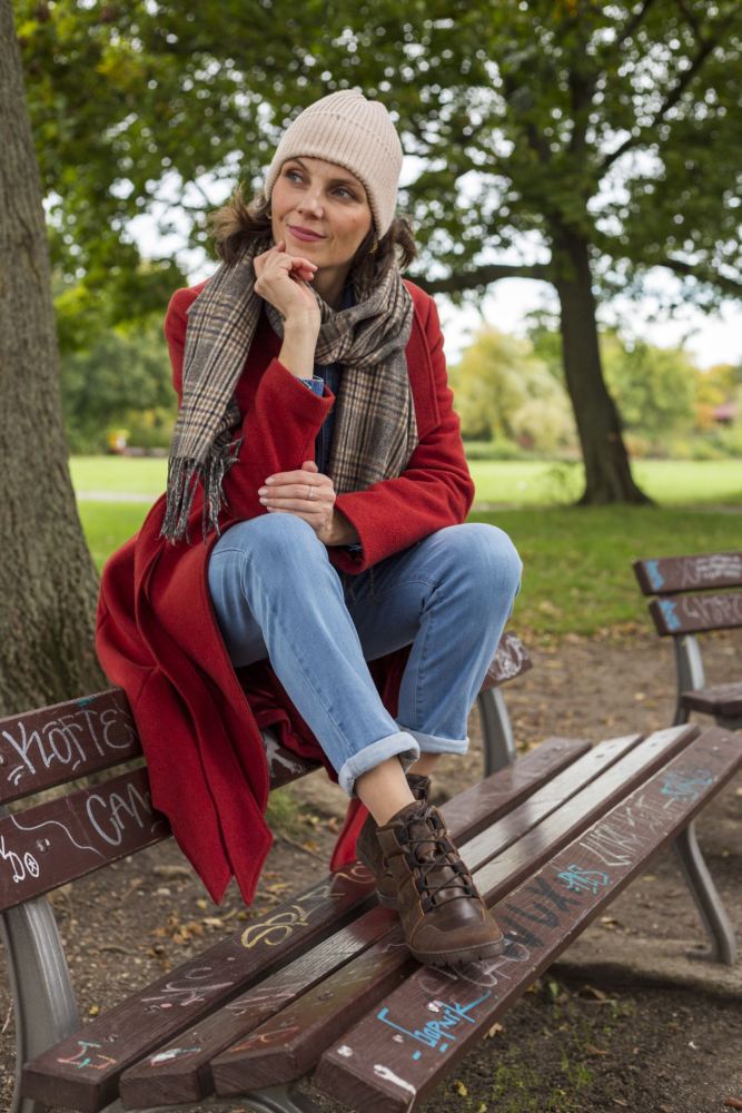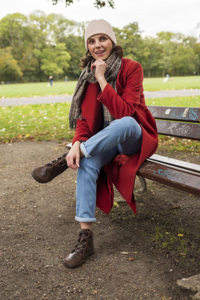 We hebben deze blote voetschoen zo ontworpen dat het er niet uitziet als een typische buitenboot van buitenaf. Dus je kunt het heel flexibel dragen. Geen probleem met wandelbroeken, jeans of zelfs de liefhebbende Chinese pose met Daqota.