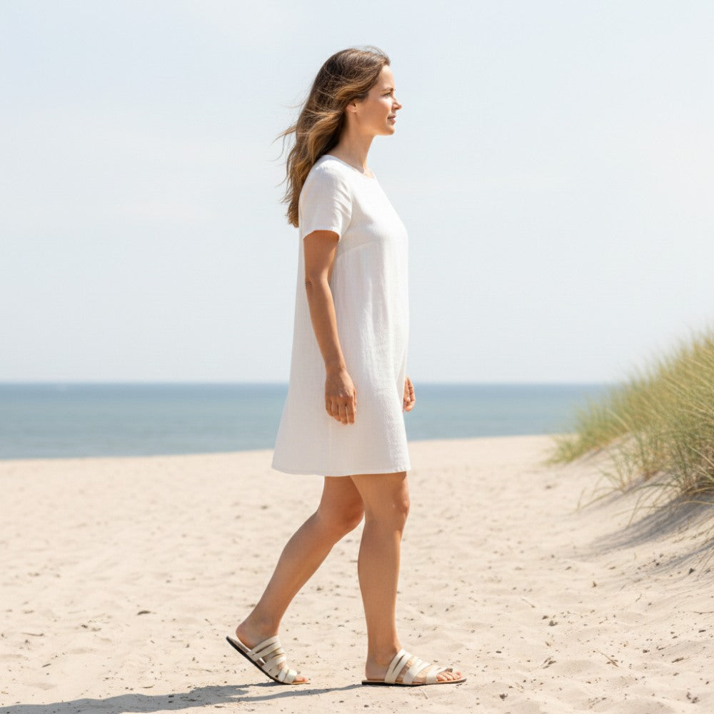 De riemen gemaakt van fijn Nappa -leer geven je. Aan de voorkant hebben we een aparte slinger bevestigd voor de grote teen om u nog meer ondersteuning te geven in de sandalen op blote voeten. Op de dunne en platte zool loop je bijzonder zacht en voel je de vloer bij elke stap en natuurlijk kun je je voet rollen.