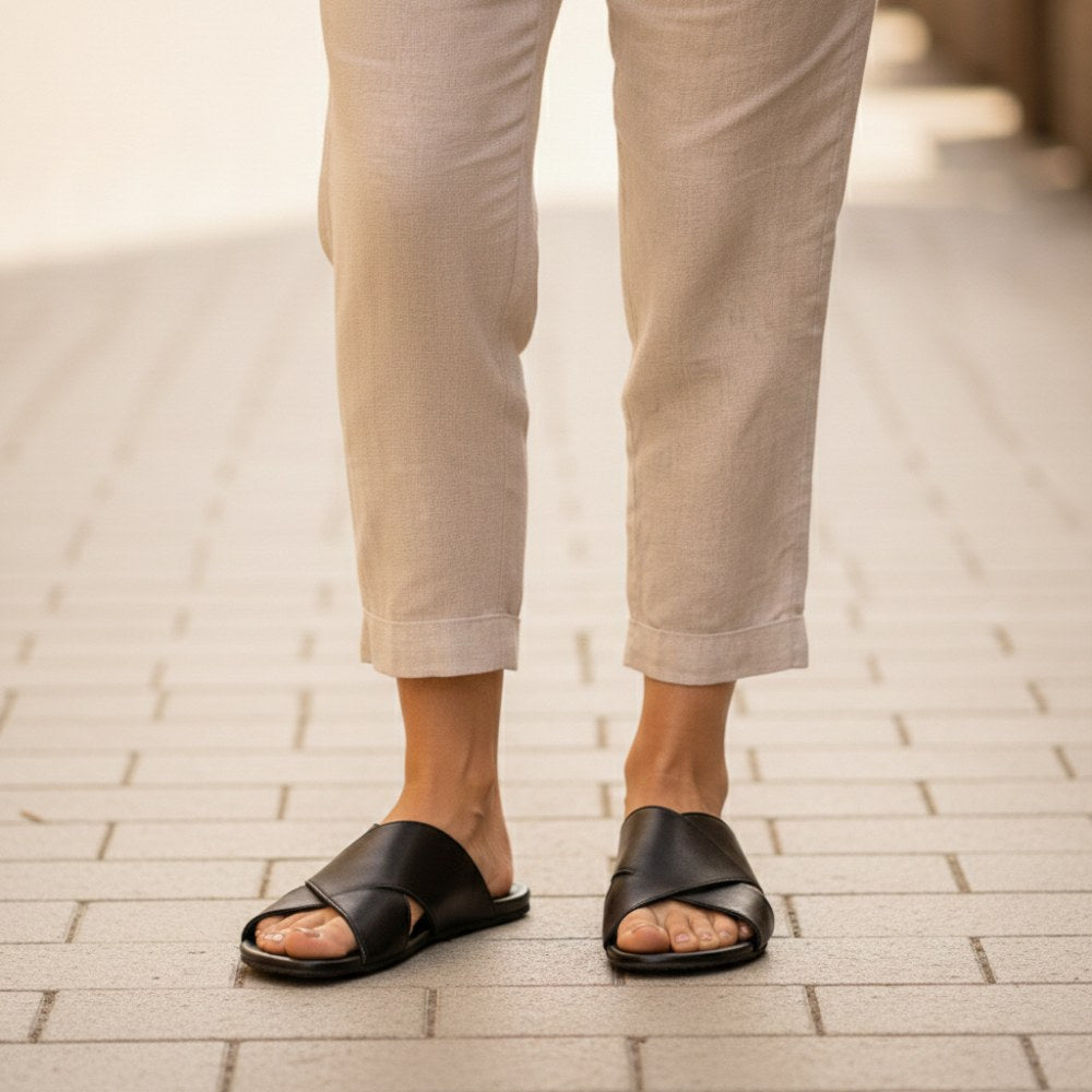 Met twee gekruiste lederen riemen die de beste stop bieden, kun je gewoon in de Black -sandalen van Manqa glijden en genieten van je dag ten volle. Geen gespen, geen franje - alleen puur comfort en vrijheid voor je voeten. Deze sandalen combineren de lichtheid van een blote voetschoen met de elegantie van een modieus accessoire.