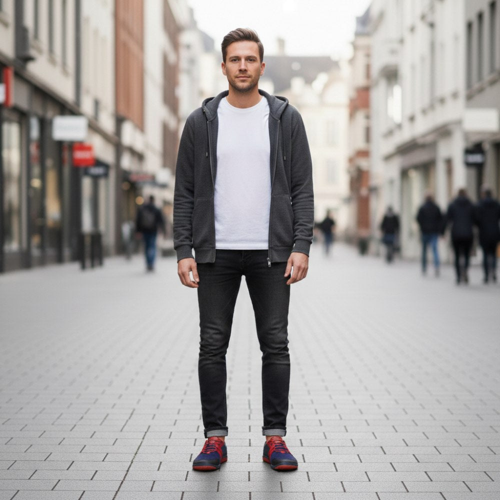 Voor Qarlton Blue hebben we materialen van hoge kwaliteit en verschillende kleuren perfect gecoördineerd. Het resultaat is een Ultramoder Barefoot -schoen voor mannen.