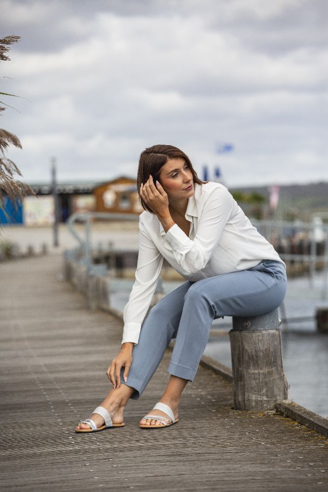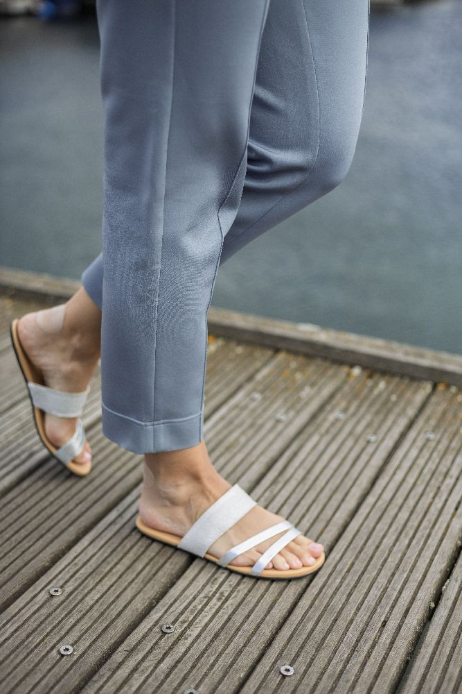 De Qate Silver White combineert elegantie en het zorgeloze gevoel van op blote voeten lopen in een stijlvolle sandaal. Hun unieke ontwerp met twee delicate zilveren riemen vooraan en een bredere witte riem boven de spanning biedt niet alleen een oogcatcher, maar garandeert ook een veilige en comfortabele pasvorm. Tijd nobel charisma past verschillende gelegenheden.