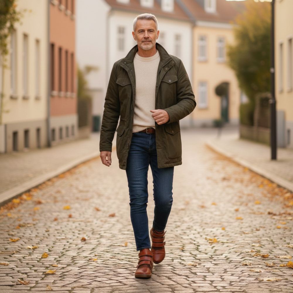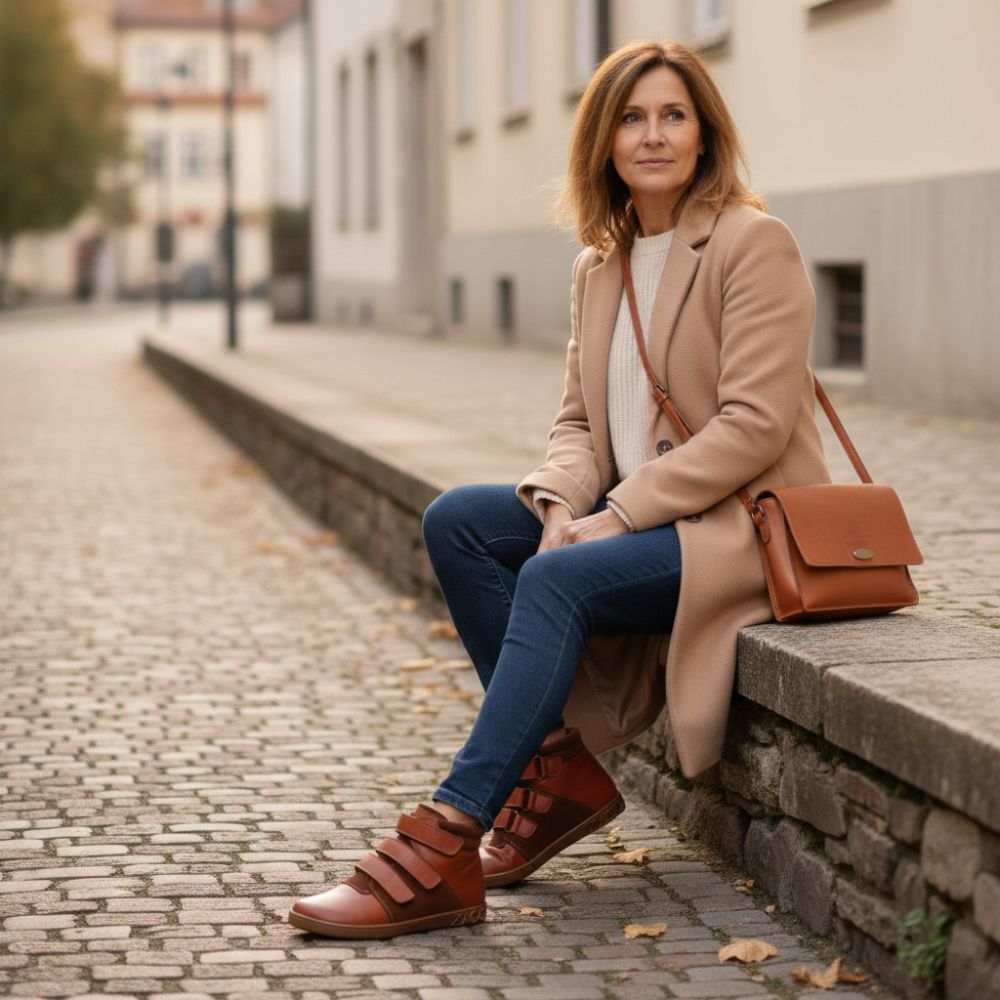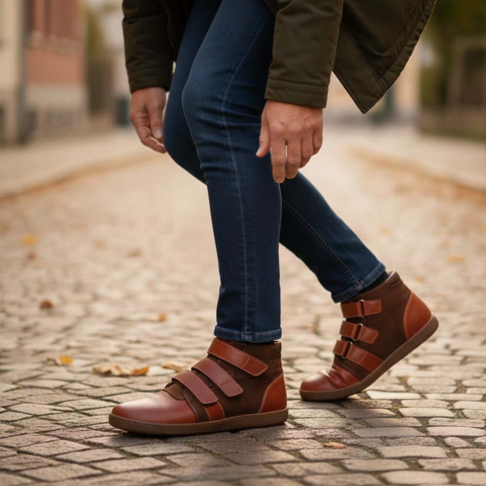 Qooper is de halfhoge blote voetschoen, die er bijzonder nobel uitziet vanwege het bruine leer en gewoon ongelooflijk comfortabel is met de praktische klittenband.