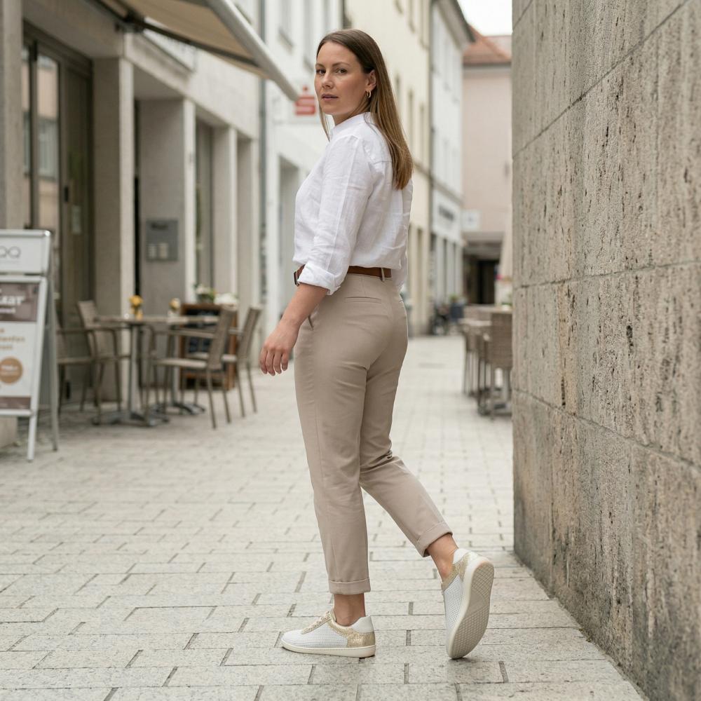 Ik wilde een witte eenvoudige sneaker, die ik naar verschillende outfits kan dragen - van sportief tot klassiek dat hij zou moeten deelnemen. Deze schoen is echt aangenaam en is niet van toepassing - mijn voet ziet er niet te groot of uniform uit. Ik draag deze sneakers met jeans, stoffen broek of rots. De metalen details krijgen deze schoen een vrouwelijke notitie.
