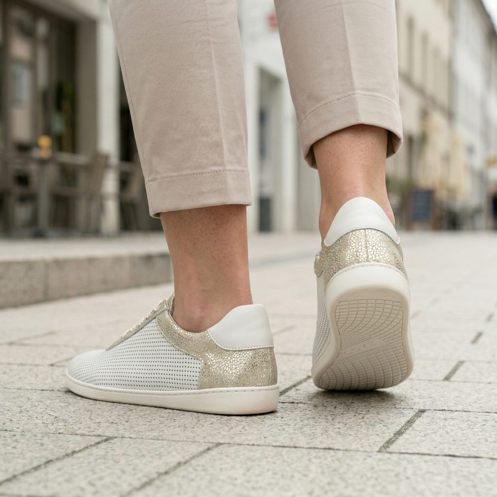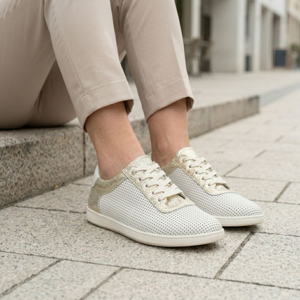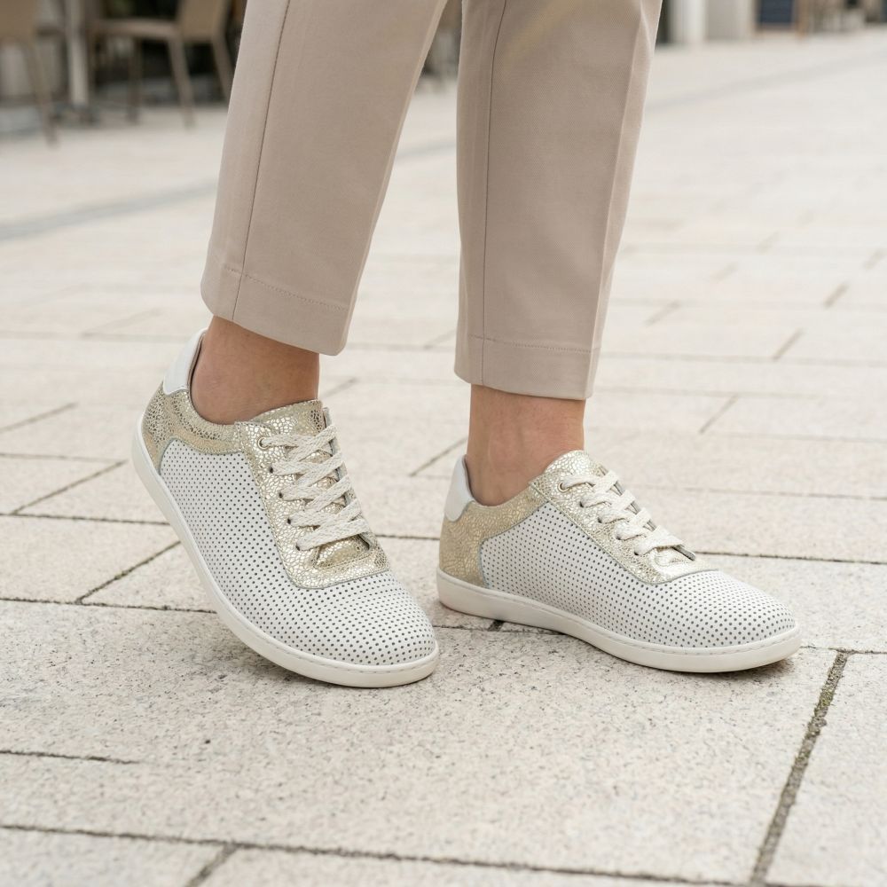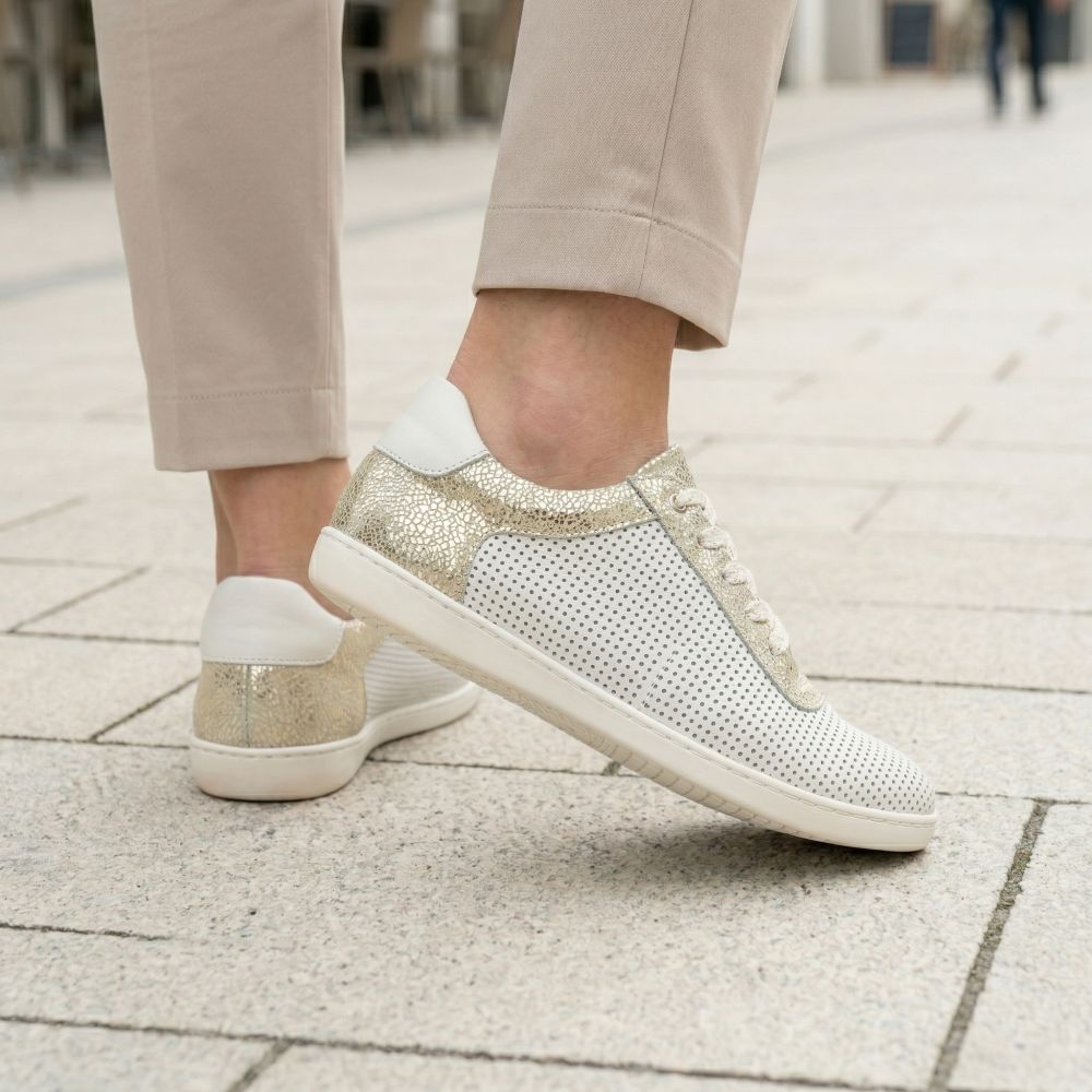 Deze op blote voeten sneaker boeit ook met een opvallend ontwerp - wit, fijn geperforeerd Nappa -leer zorgt voor luchtpermeabiliteit en de details in goud op de schacht en de veter bieden dat zeker iets!
