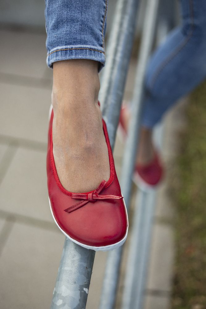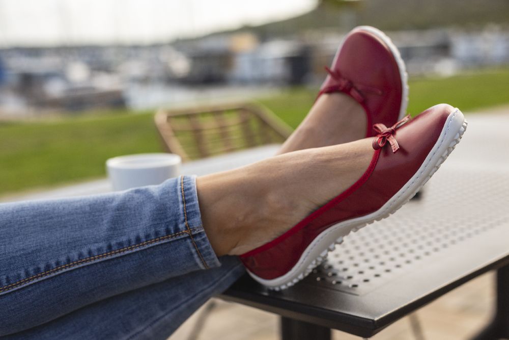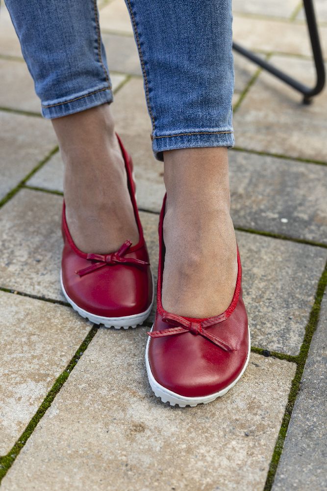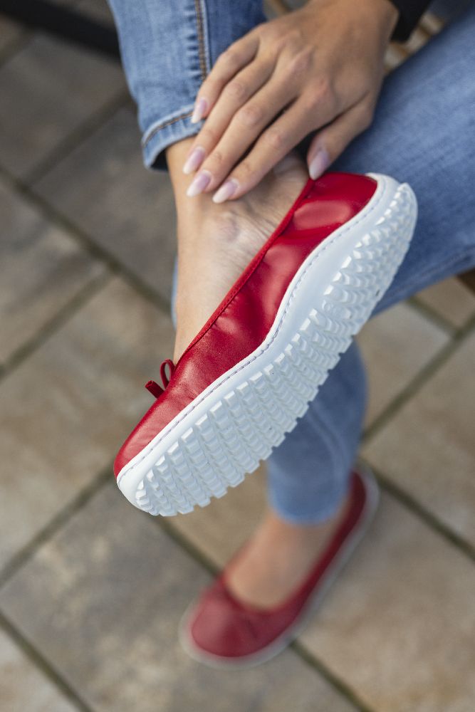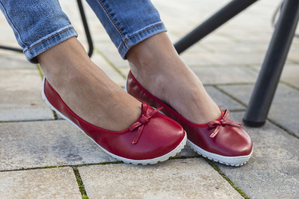 Het fijne, donkere rood glad leer en de subtiele lus geven de ballerina een delicate, vrouwelijke look. Door de gebroken sneakerzool ziet hij er sportief, fris en modern uit. De zool op blote voeten zorgt ook voor een goede grip en is tegelijkertijd zo dun en flexibel dat uw voeten de vloer voelen bij elke stap.