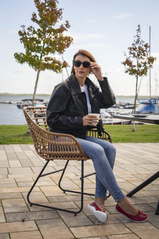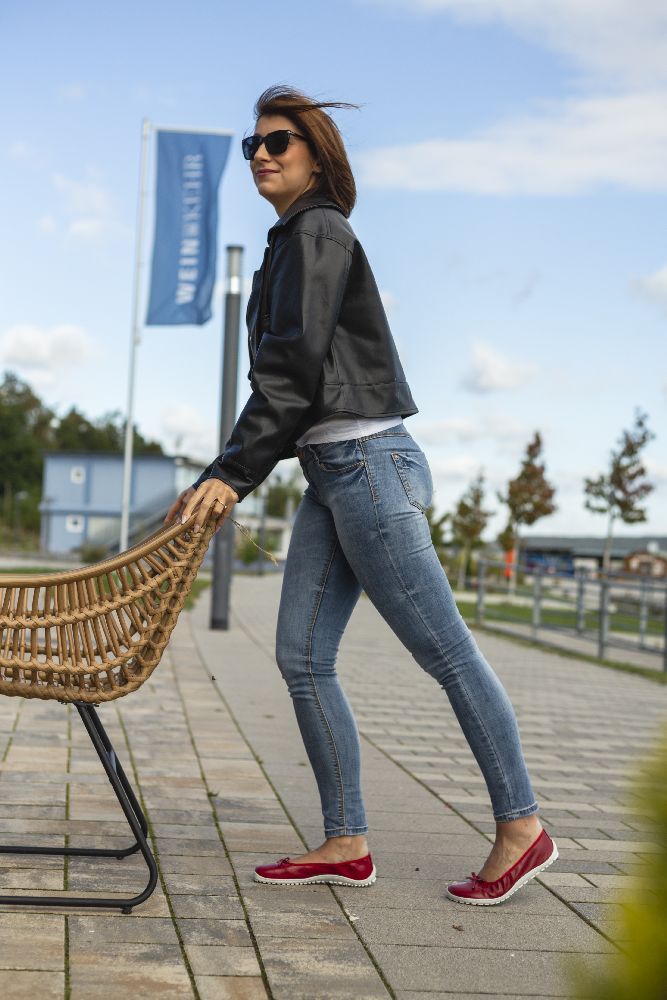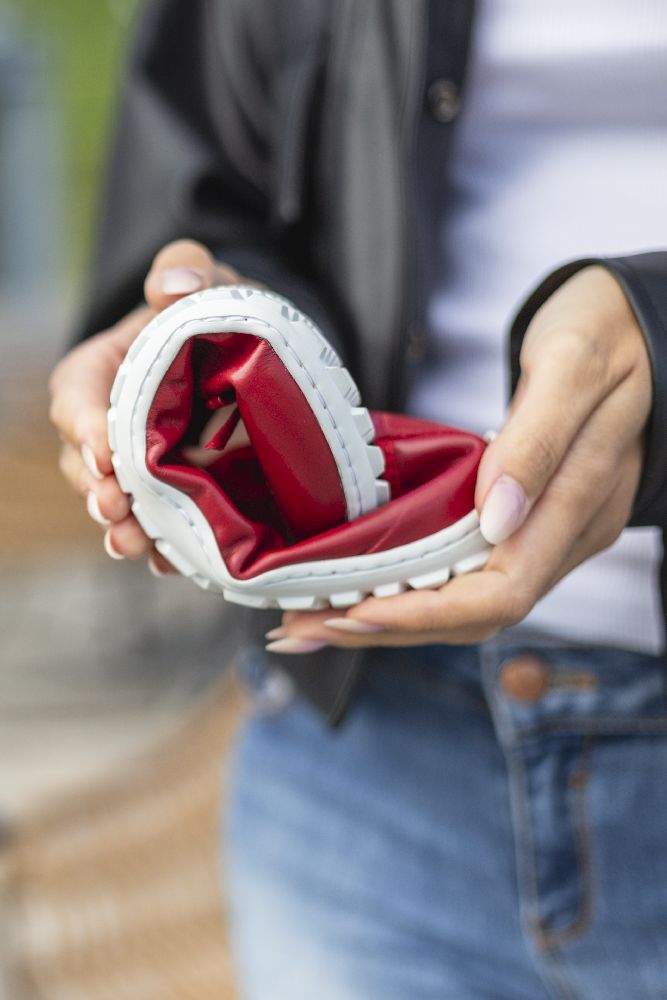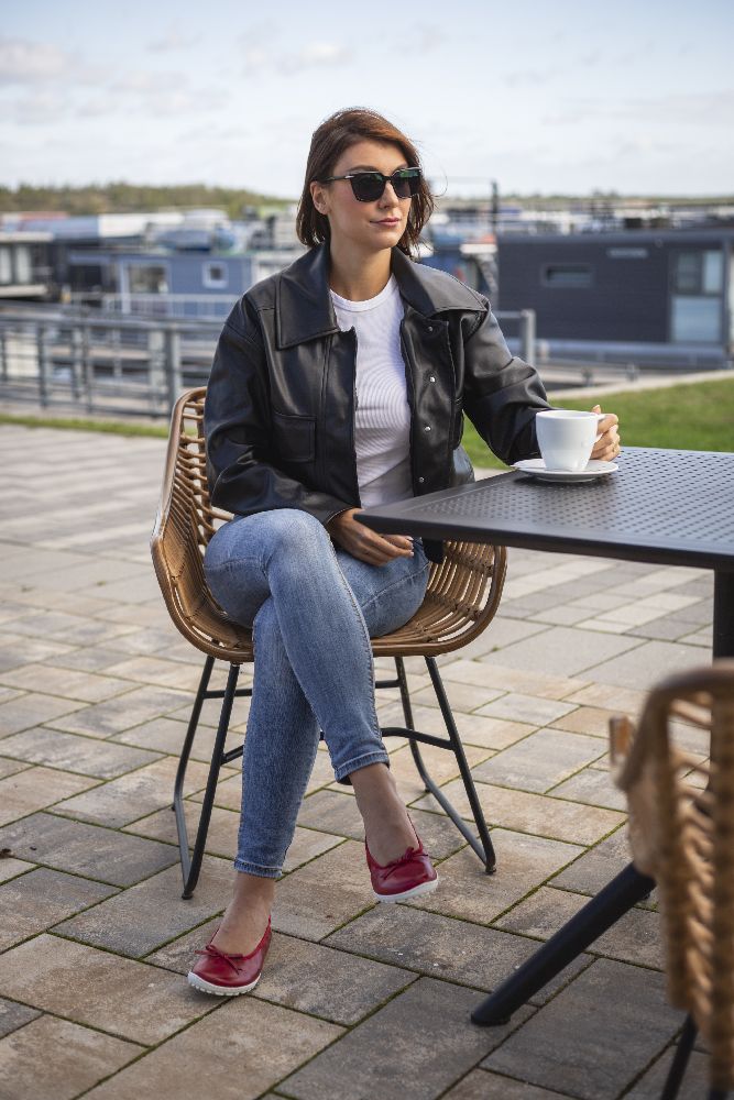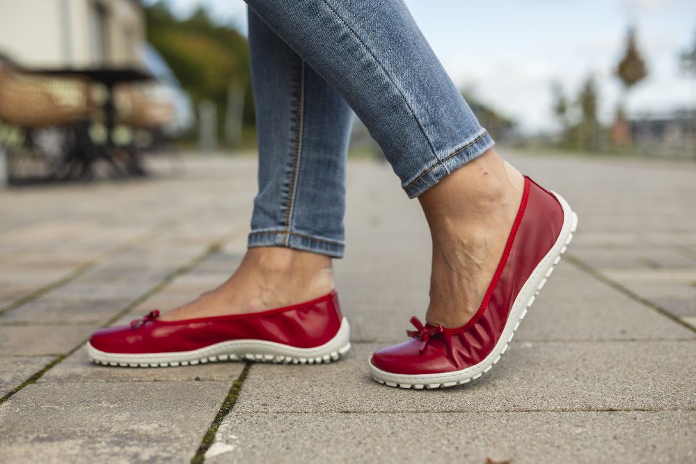 Het fijne, donkere rood glad leer en de subtiele lus geven de ballerina een delicate, vrouwelijke look. Door de gebroken sneakerzool ziet hij er sportief, fris en modern uit. De zool op blote voeten zorgt ook voor een goede grip en is tegelijkertijd zo dun en flexibel dat uw voeten de vloer voelen bij elke stap.